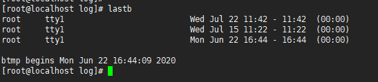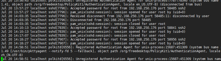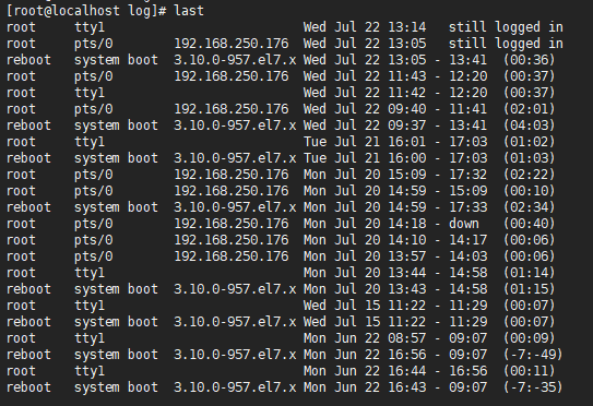 ps:该日志为二进制文件,不能用诸如tail/cat/等命令,使用last命令查看。