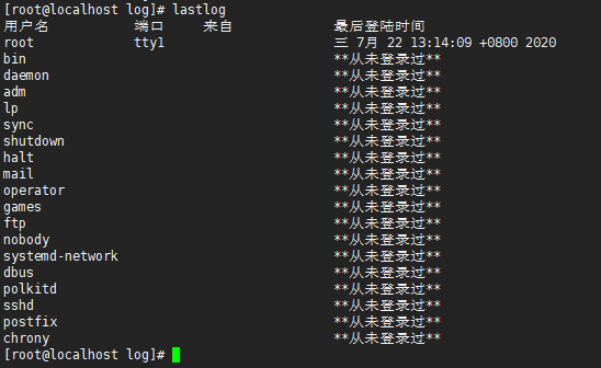 ps:该日志不能用诸如cat、tail等查看,因为该日志里面是二进制文件,可以用lastlog命令查看,它根据UID排序显示登录名、端口号(tty)和上次登录时间。如果一个用户从未登录过,lastlog显示 Never logged。