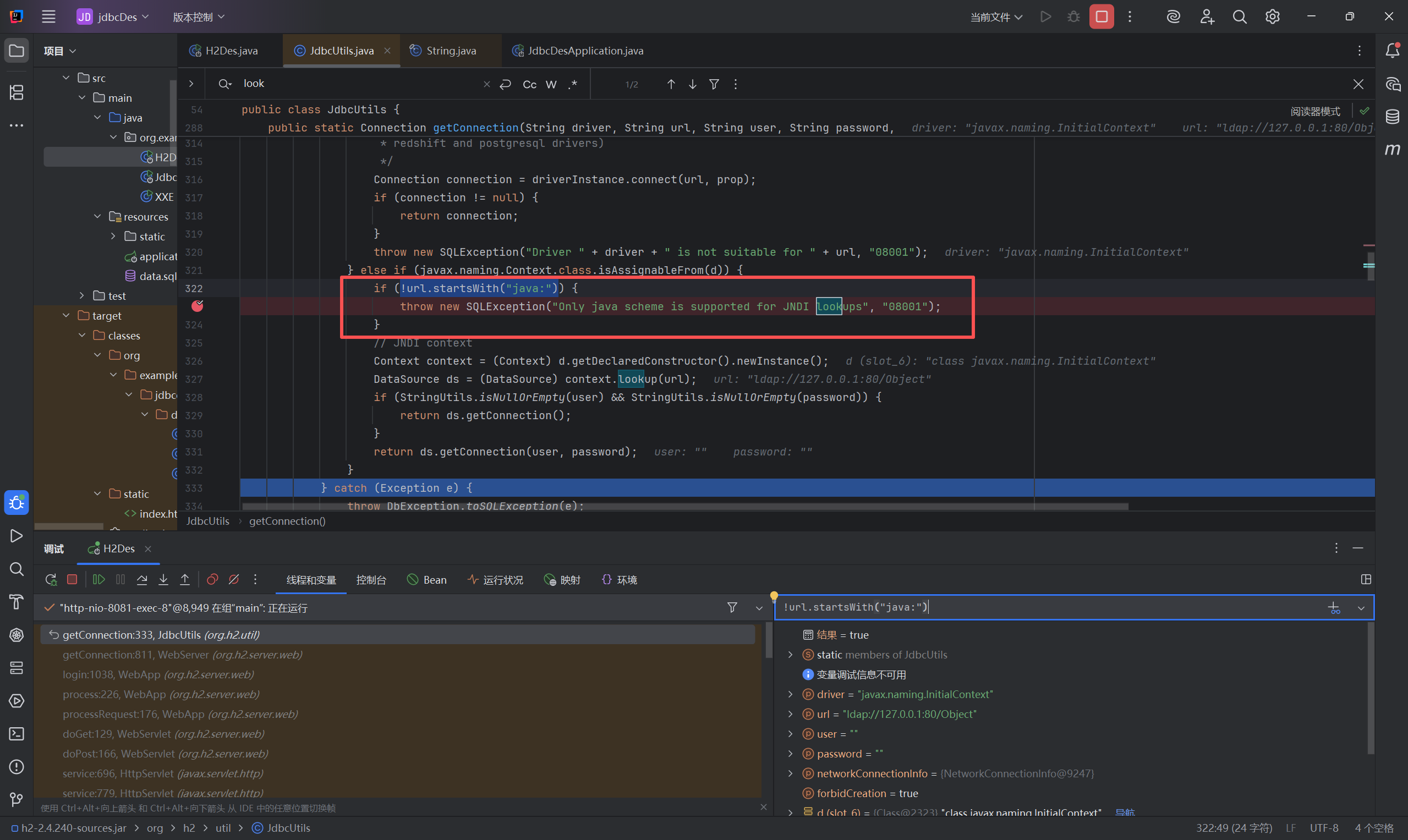 H2允许通过jndi的形式加载数据源,但没有对lookup()参数做校验导致漏洞
